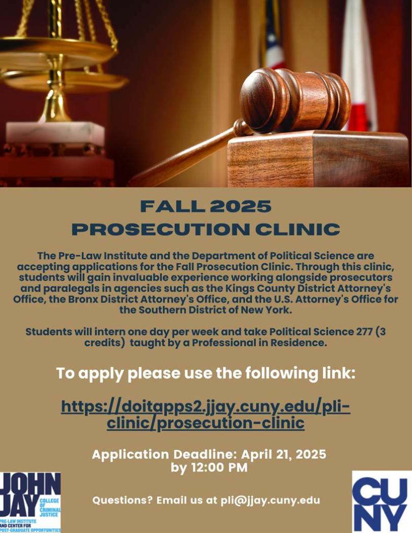 The application period for the Fall 2025 Prosecution Clinic is now closed. Applications for Spring 2026 will open in October 2025 here: Pre-Law Institute.